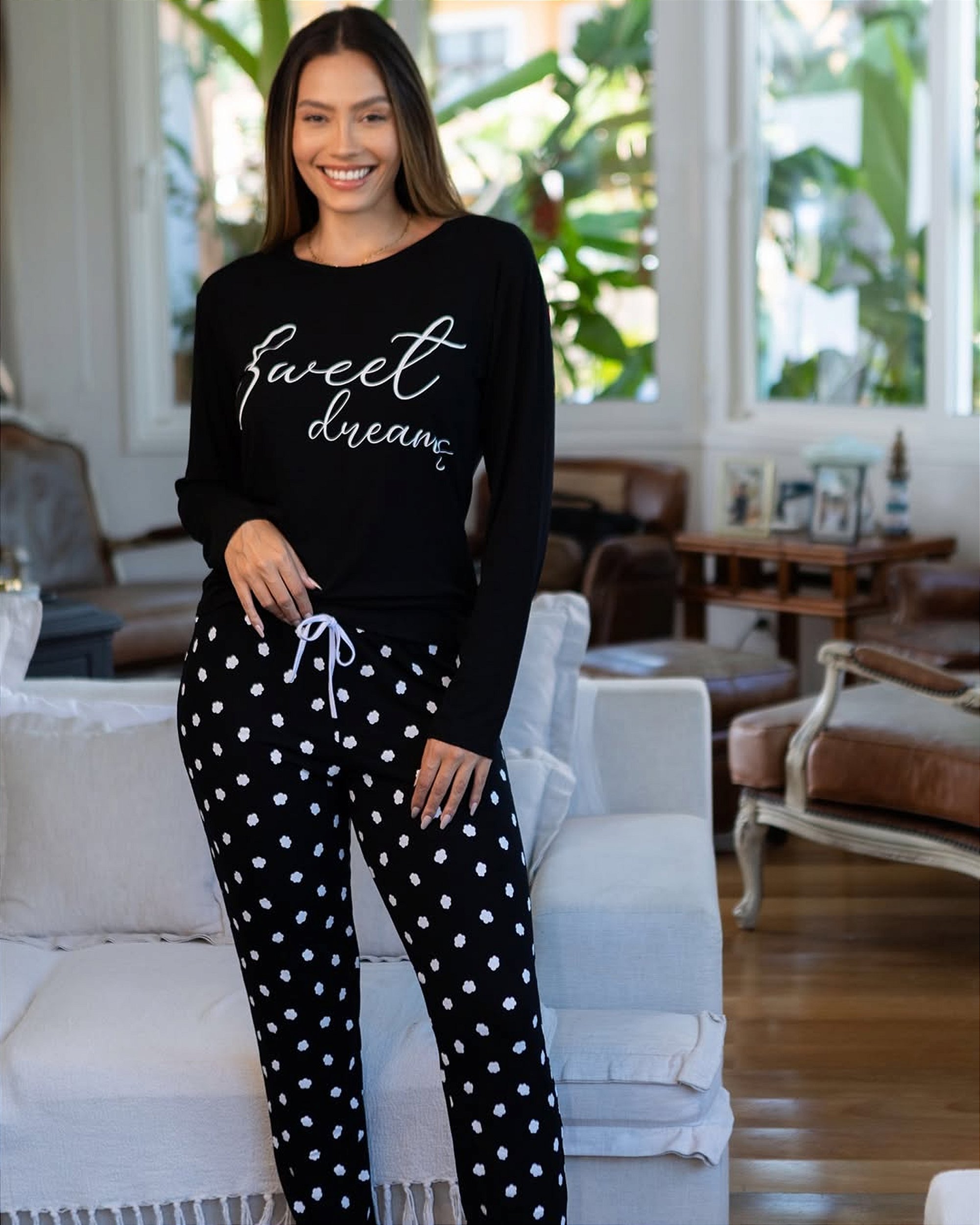 A blusa preta com a frase “Sweet Dreams” traz um toque delicado e inspirador, enquanto a calça estampada com nuvens brancas dá um ar divertido e moderno ao look de dormir. Um conjunto pensado para mulheres que valorizam o conforto e o autocuidado, seja para descansar, ver um filme ou curtir o fim de semana em casa.