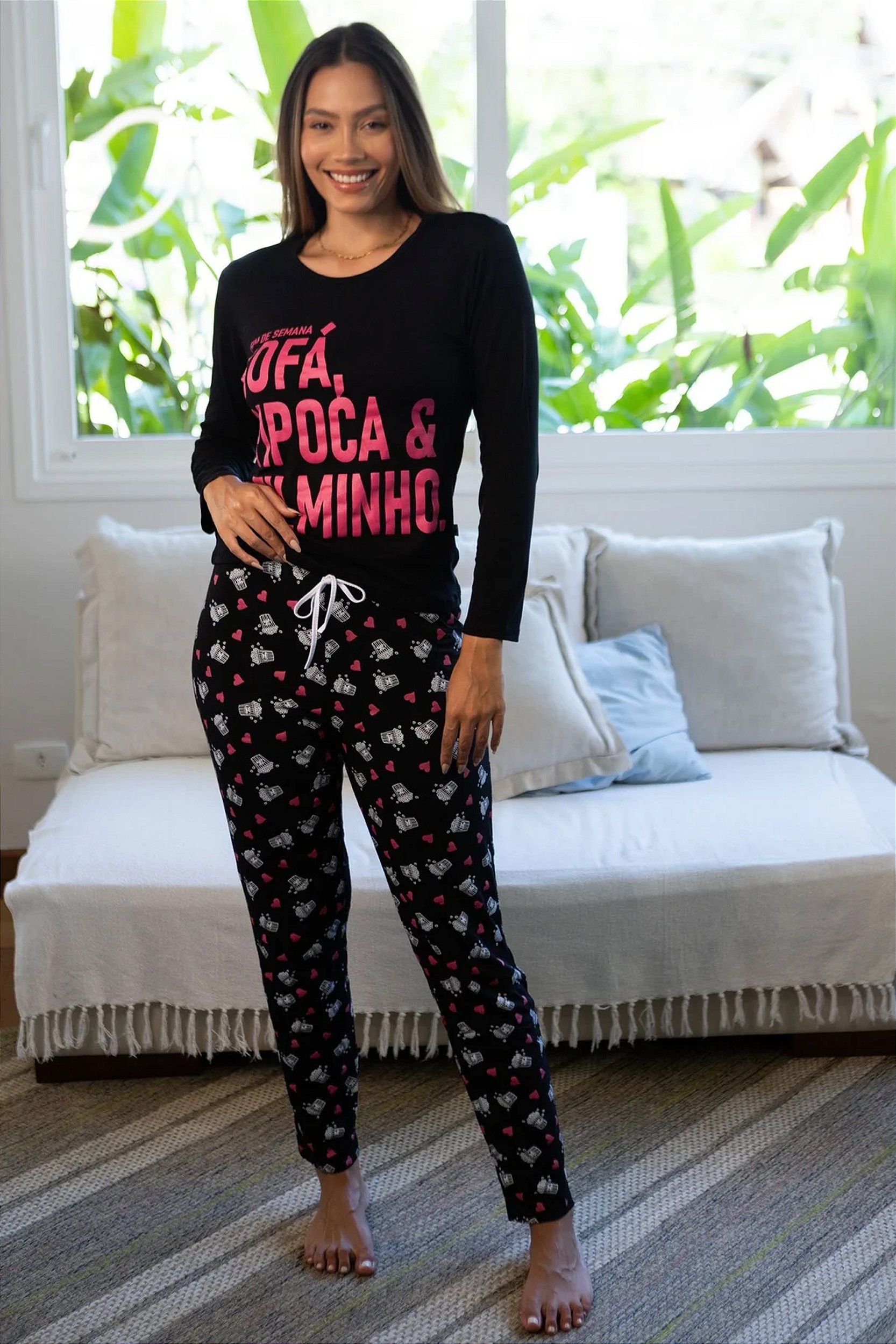 A blusa de manga longa preta com a frase “Sofá, Pipoca & Filminho” traz uma vibe divertida e aconchegante, enquanto a calça estampada com baldes de pipoca e corações completa o visual com charme e personalidade. Perfeito para maratonar séries ou curtir momentos relaxantes em casa!