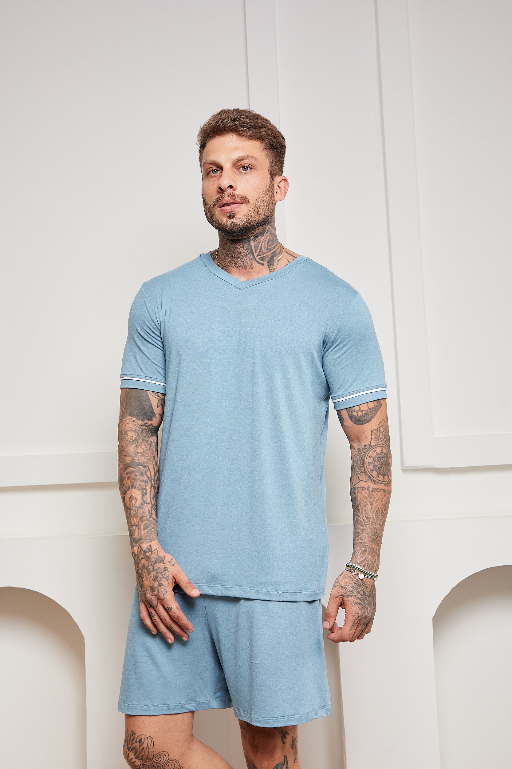 Leveza, conforto e estilo em um único conjunto. O Pijama Masculino na cor azul geada foi desenvolvido para o homem moderno que valoriza bem-estar sem abrir mão de um visual sofisticado.